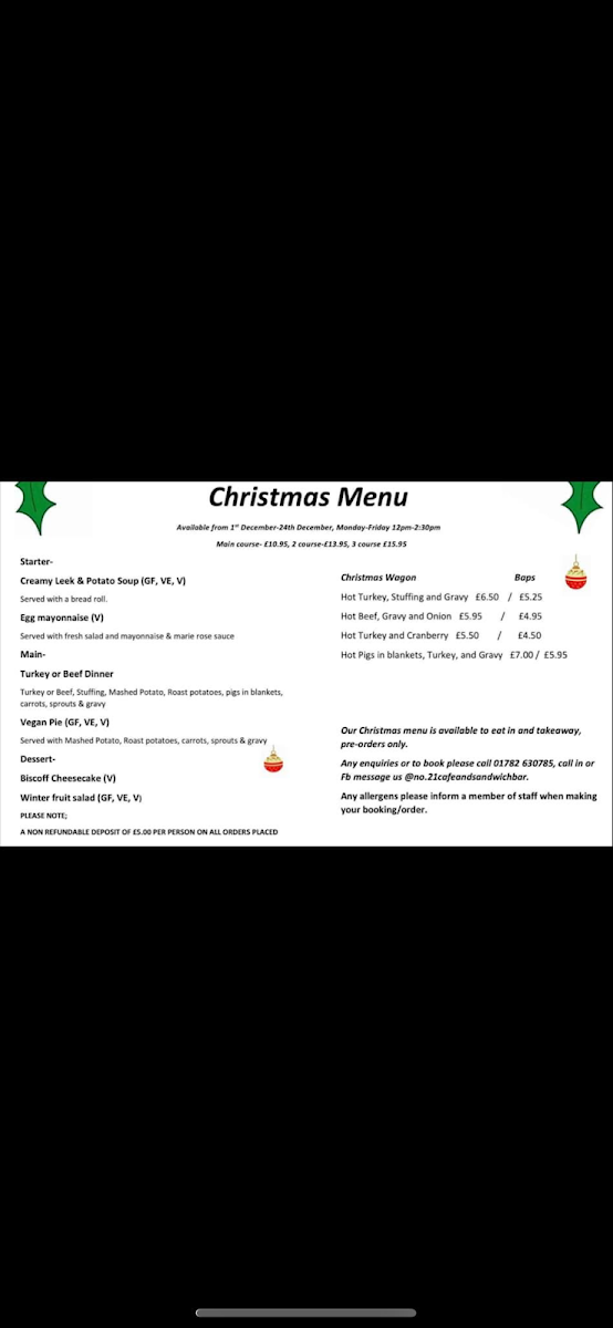 No.21 offers a delightful range of options that cater to both traditional tastes and modern dietary preferences. Start your day off right with their breakfast sandwiches – each bite is a warm hug for your taste buds! Whether it’s the classic Bacon & Egg Bap or the hearty Sausage & Egg Bap, you’ll find that every sandwich is lovingly prepared. And let’s not forget the rich flavors packed inside their Turkey or Beef Dinner and the scrumptious Vegan Pie, perfect for those looking for a satisfying meal without compromising on taste.